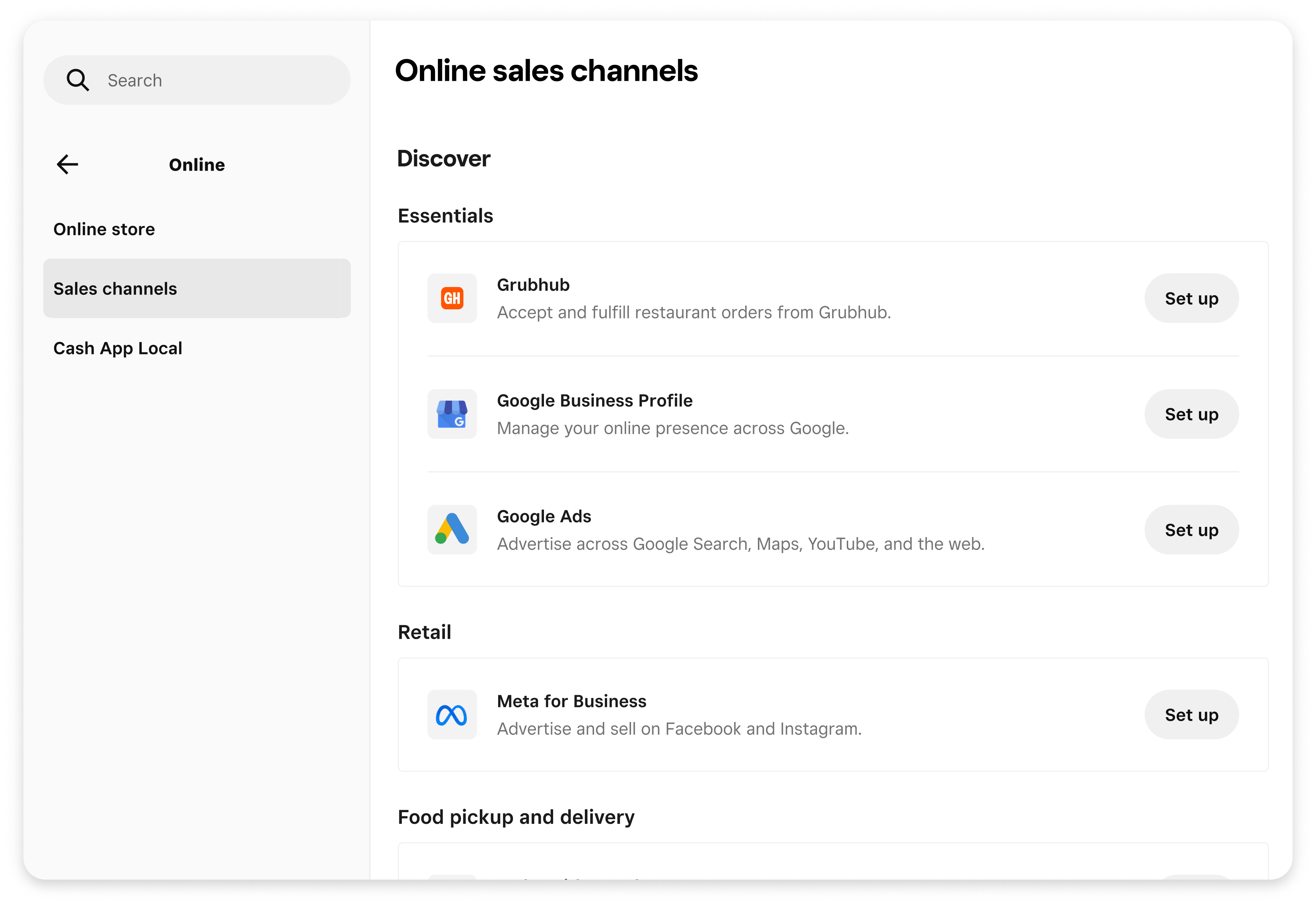 1. Log in to your Square Dashboard and go to Online > Sales channels to find the Grubhub Integration. If you do not have a Grubhub account, follow the prompt for no account to sign up and complete the integration onboarding.