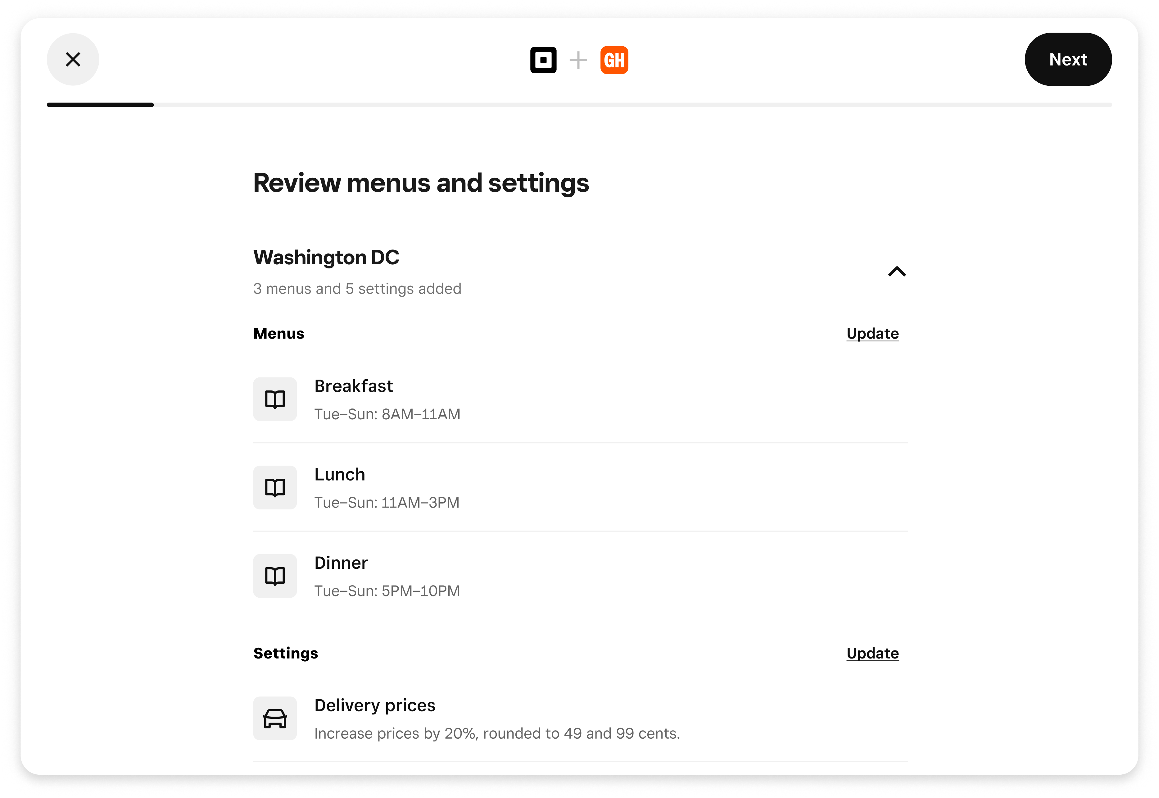 Select the menus you want to publish on your Grubhub store(s) and set your menu hours. For each menu, you can keep prices the same or boost them using the price override feature.